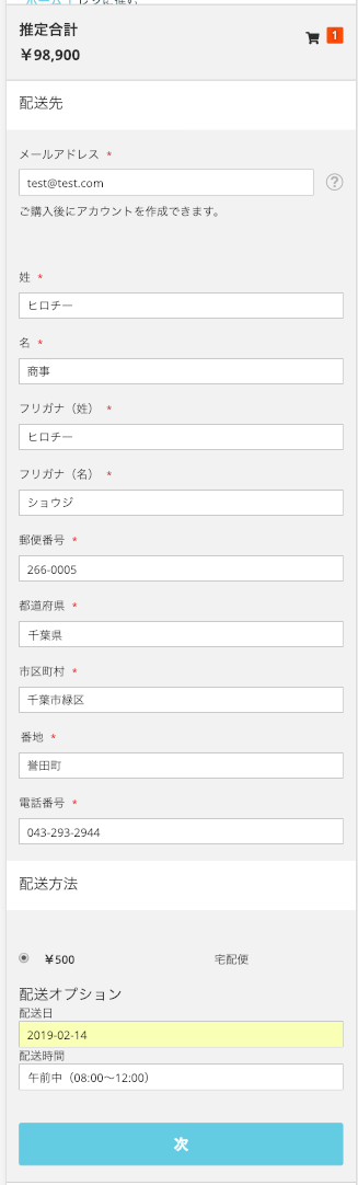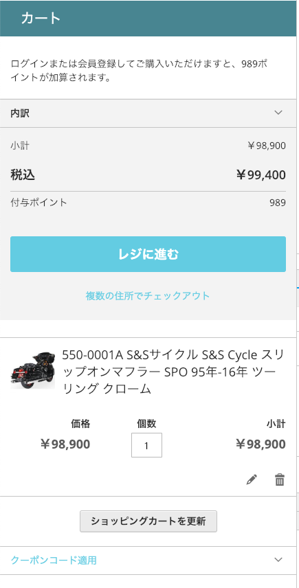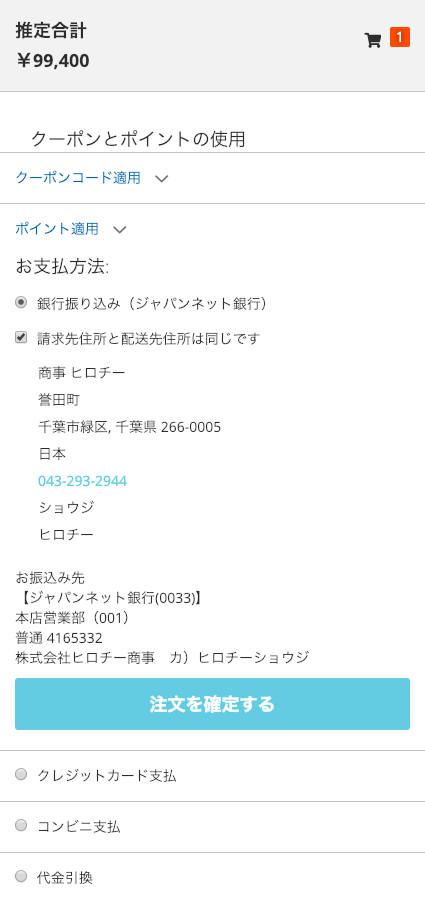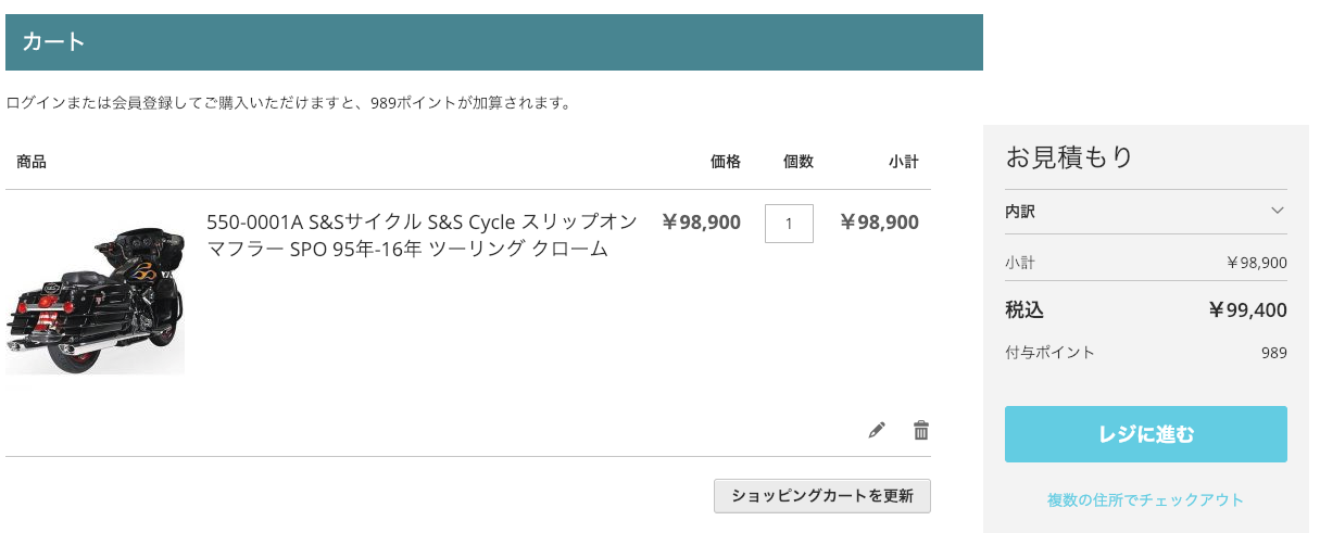 数量が決定しましたら ”レジに進む” ボタンをクリックして注文手続に進んでください。