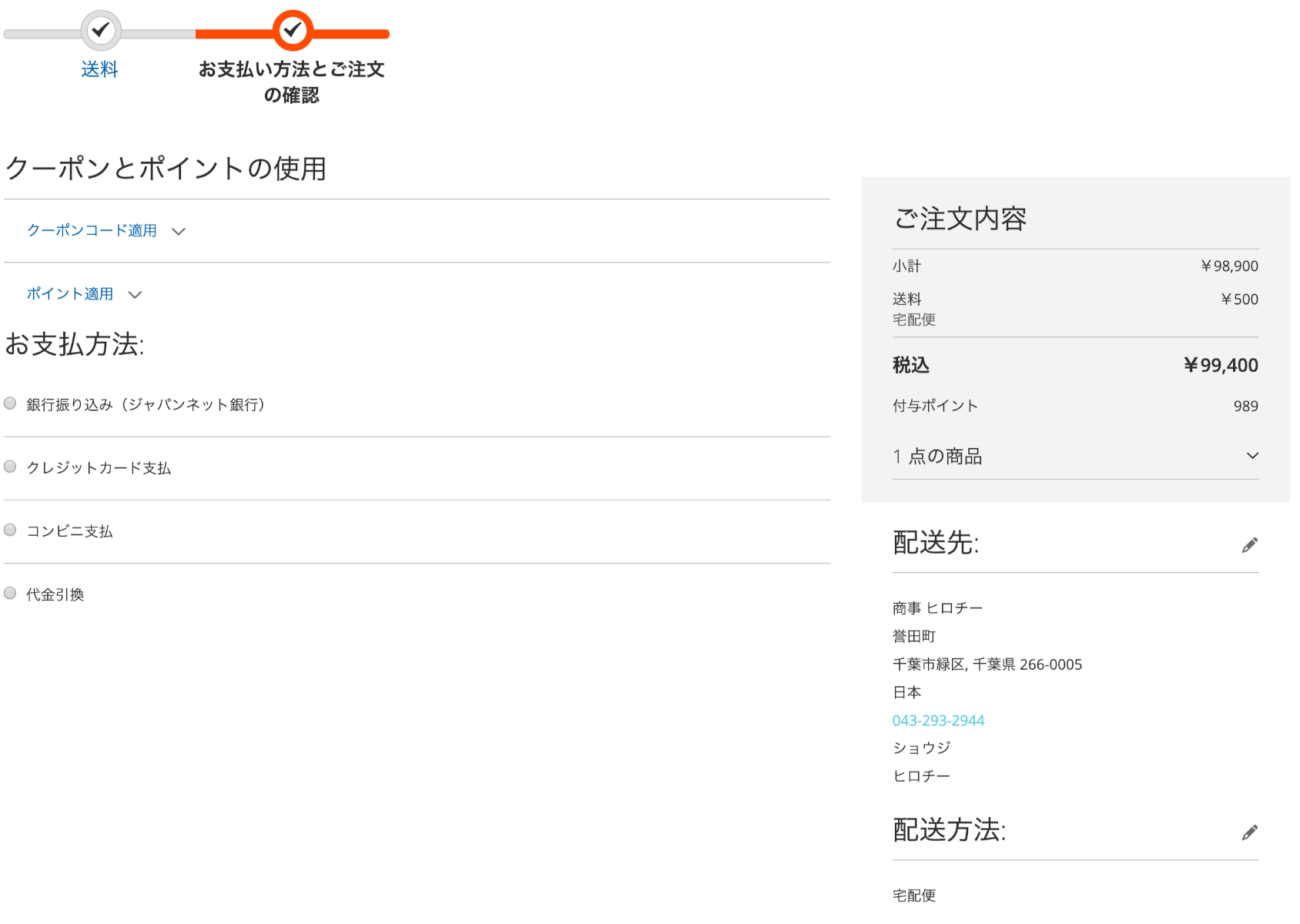 ・お支払方法を選択してください。代金引換、銀行振り込み、クレジットカード支払、コンビニ支払の四種類となります。